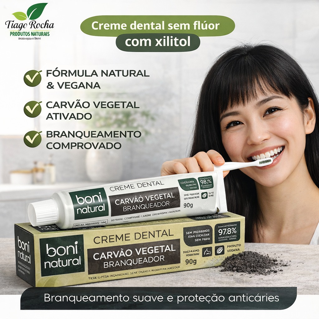 O Creme Dental Vegano Carvão Vegetal foi desenvolvido para proporcionar uma limpeza bucal profunda de forma natural. Sua fórmula contém carvão ativado, conhecido por sua capacidade de absorver impurezas, remover manchas superficiais e auxiliar no clareamento dental, sem agredir o esmalte.