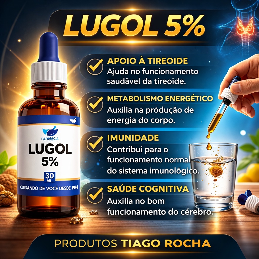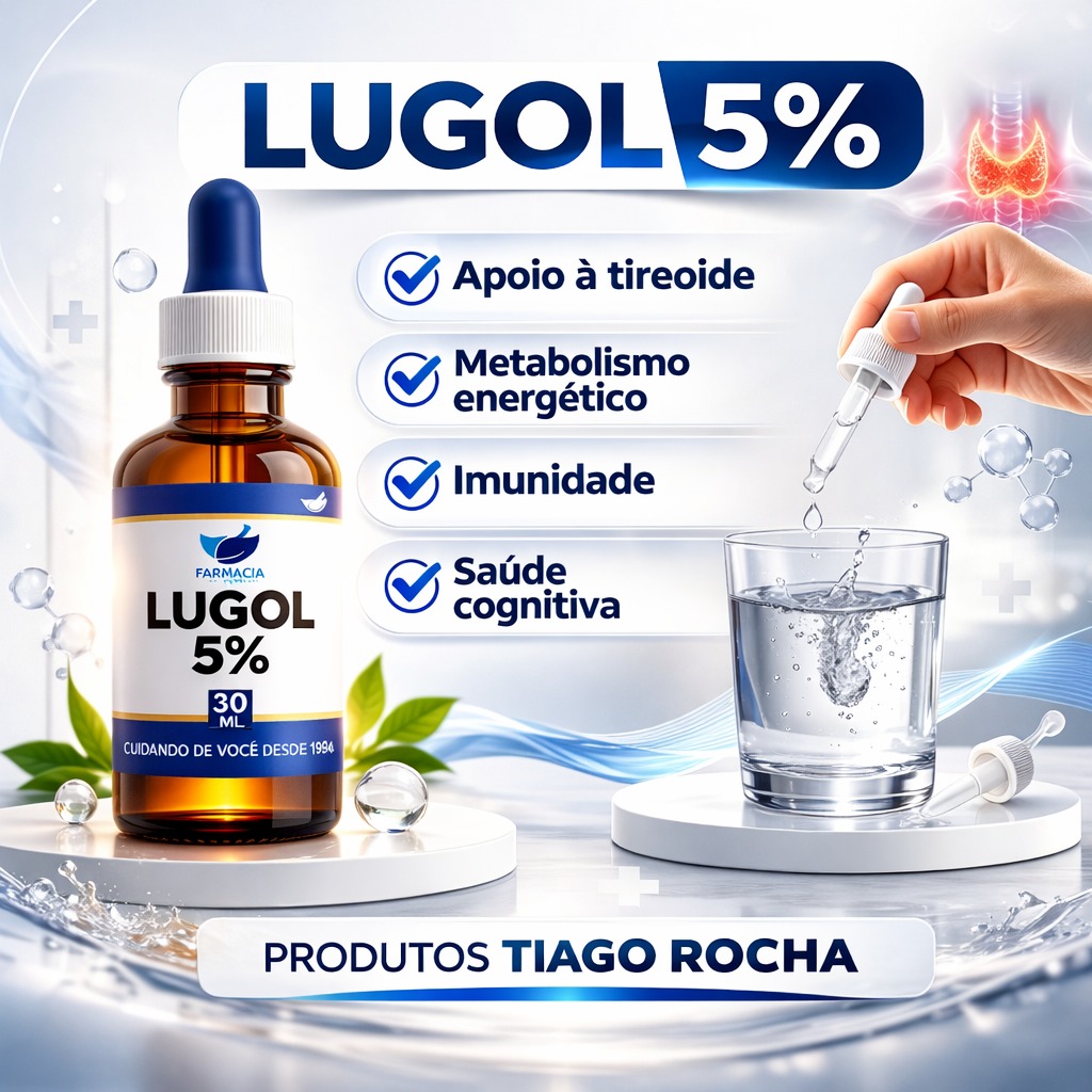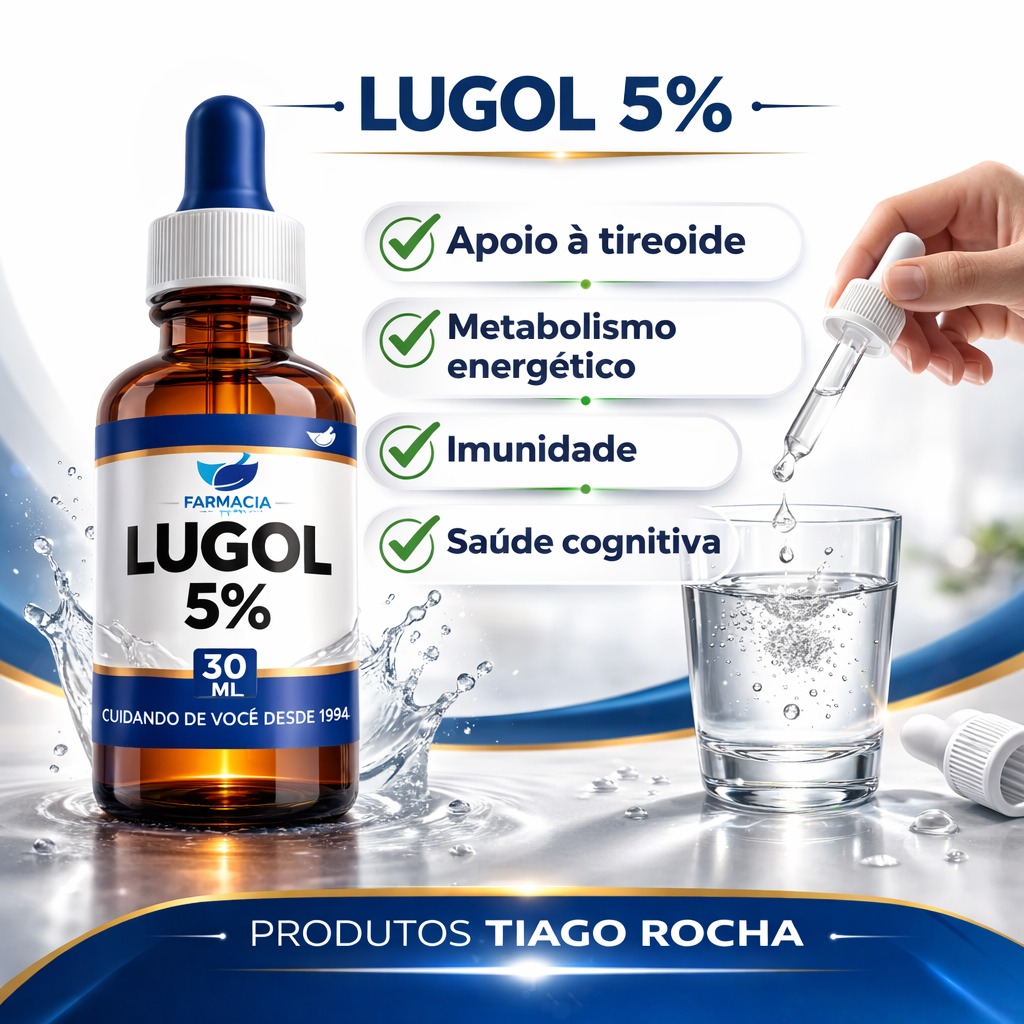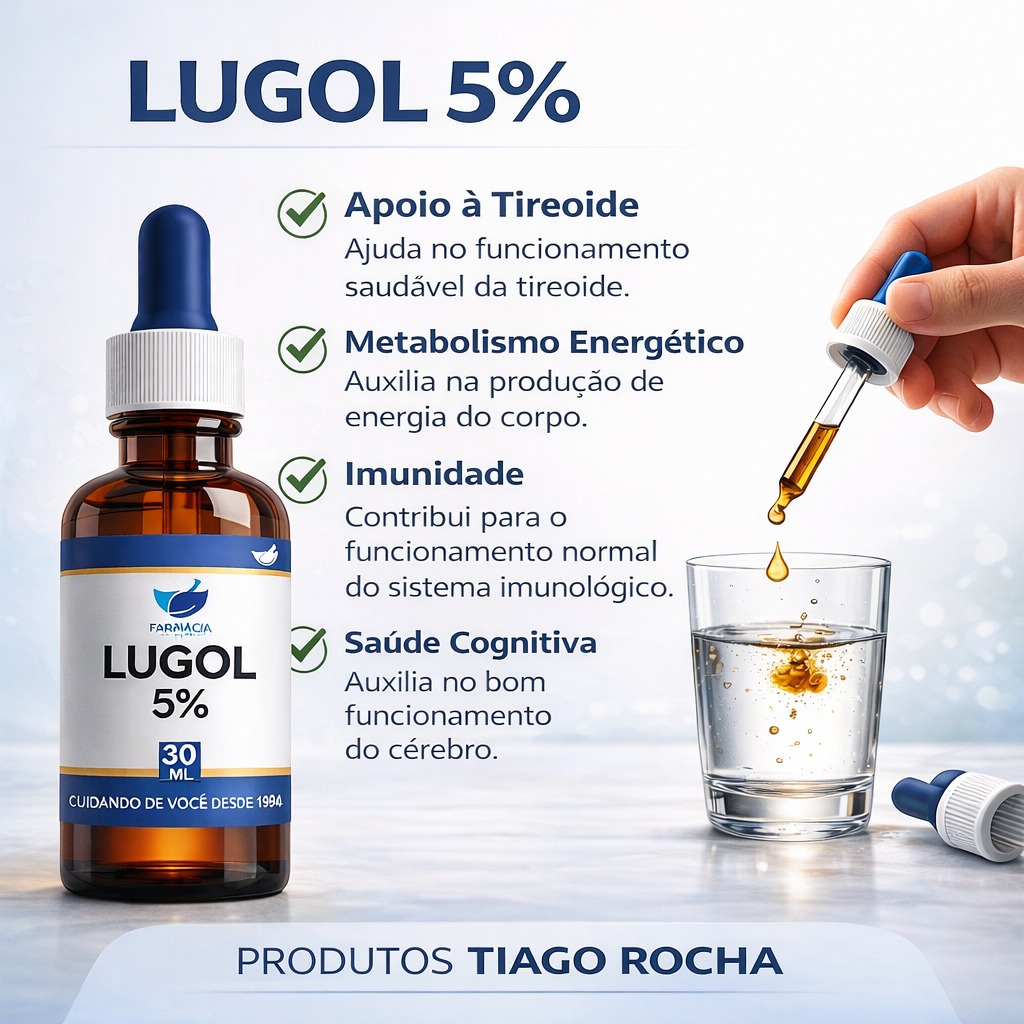 Conteúdo da Embalagem: 1 frasco de Lugol 5% – 30ml, acompanhado de um conta-gotas para facilitar a dosagem.