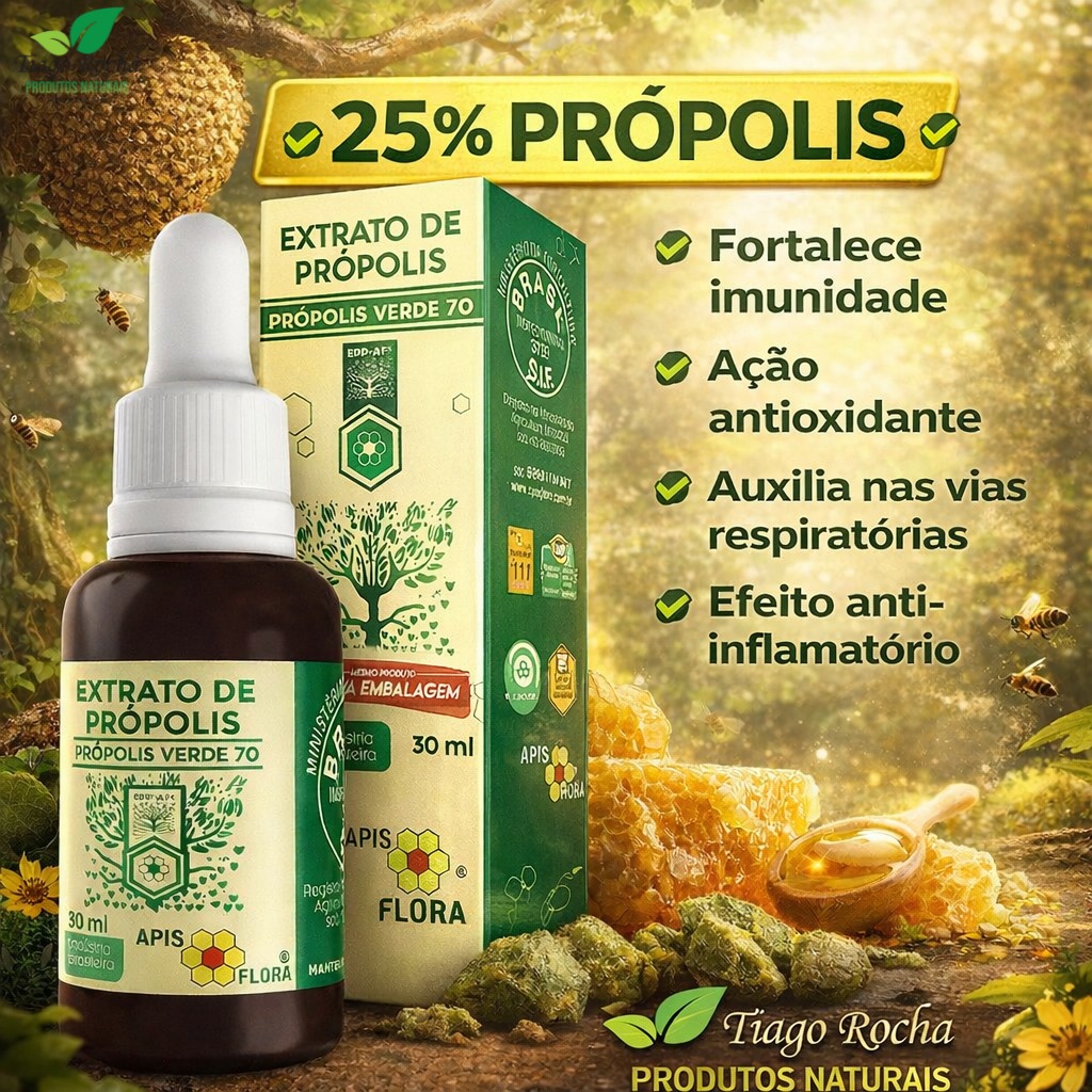 A própolis fortalece a imunidade, combate infecções nas vias aéreas superiores, como amigdalite, bronquite e dores de garganta, evita a tosse com catarro e auxilia no tratamento de gripes e resfriados. Possui ação cicatrizante, antibacteriana, antimicrobiana e anti-inflamatória.