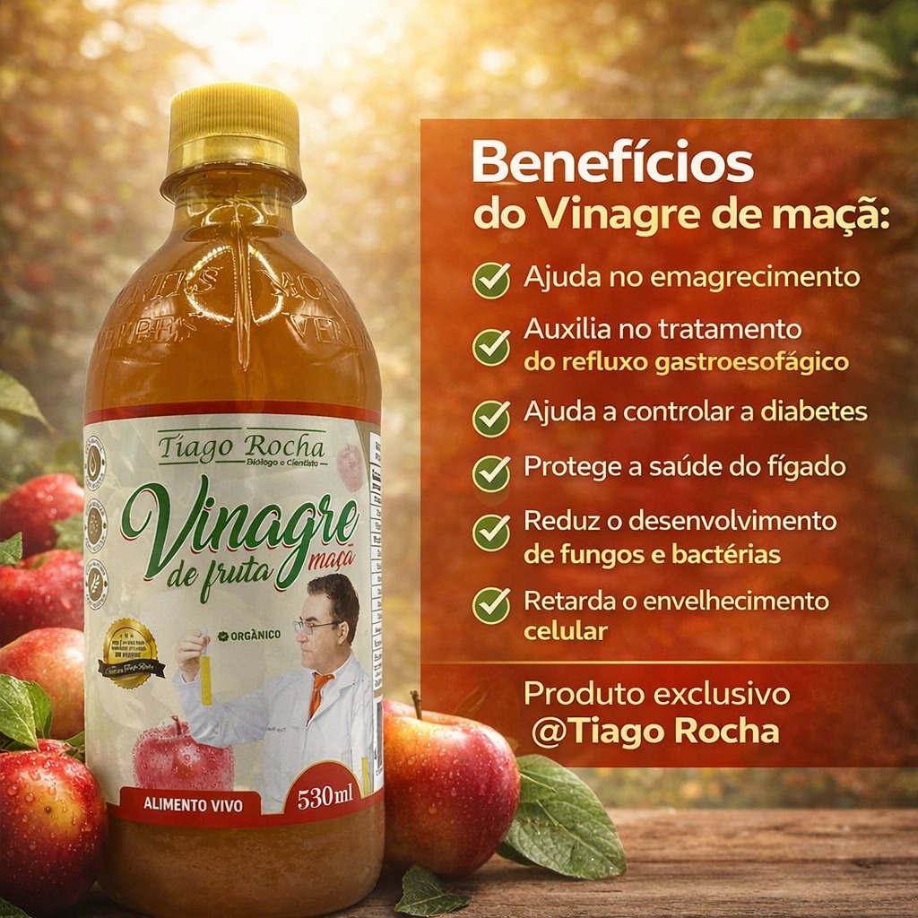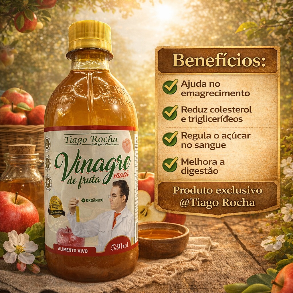 Esse alimento tem ajudado muitas pessoas á emagrecer, diminuir colesterol e triglicerídeos e reduzir a gordura no fígado. Com centenas e centenas de depoimentos ao longo dos anos sobre os benefícios dessa fantástica bebida, desenvolvemos o vinagre exclusivo da marca Tiago Rocha, com selo de qualidade e que realmente vai lhe auxiliar na sua saúde.